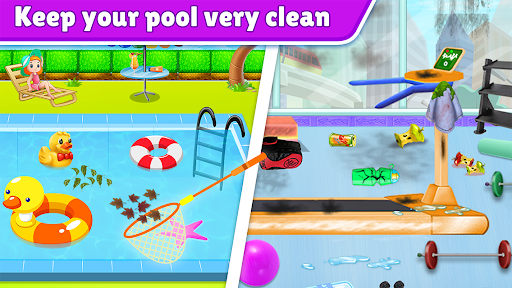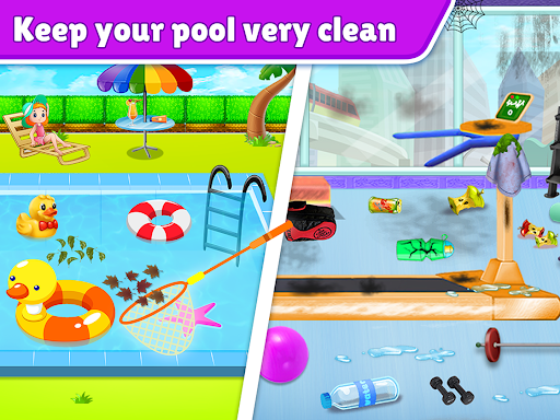 The pool has dust, mud and dirt sticking to it. Pick up your cleaning tools, a garbage can and get to the cleaning task. Pick up the pieces of trash and throw it in the dustbin. Use the towel to scrub the floor tiles and pool sides. Now clean the dirt and fill water in to the pool.