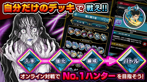 Level up your character and create your own deck while experiencing HUNTER×HUNTER's immersive world. Additionally, when you select a "Kizuna Character," that character is reflected on your home screen and battle screen, and by increasing your Kizuna level, you can unlock skins and stamps exclusive to your chosen character.