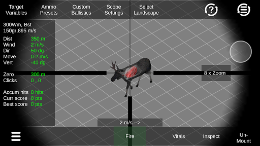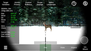 Practice deer hunting or other game types using realistic adjustable scope, accurate ballistics and lots of environment variables such as distance, wind, movement, direction, vertical angle and amount of daylight.