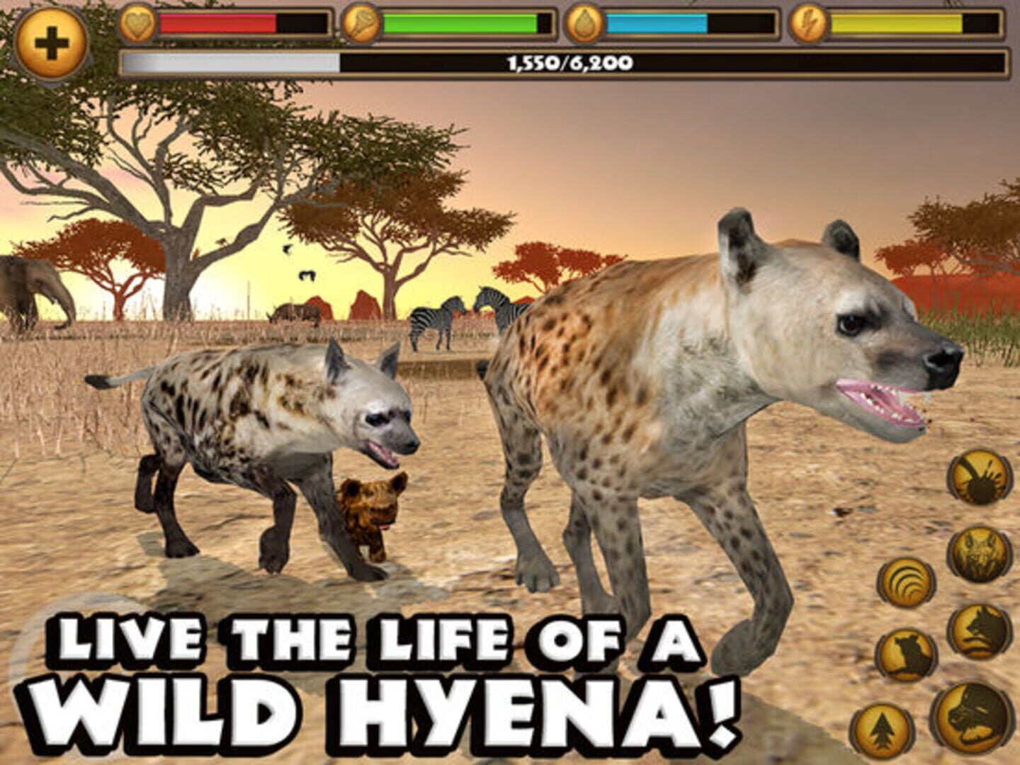 Explore a massive environment that is over three times the size of previous simulators, filled with over 25 unique species of African animals. Use the new touch-based controls and first-person camera mode to maneuver your way through the world from the hyena's perspective.