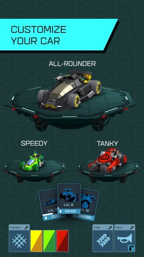 In the Hyperdrome garage, you'll have your pick of a pool of cars, each fully customizable to match your playstyle perfectly. Whether you prefer a fast and nimble ride or an armored powerhouse, you can change and upgrade everything from the components to the colors and designs, ensuring that your ride is as unique as you are.