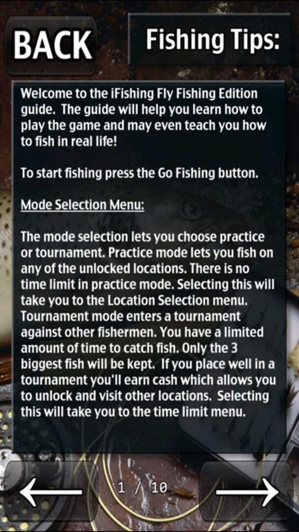Fly Fishing comes with a Practice and Tournament mode, so you can choose what's best for you, and keep a record of your achievements in the Trophy room. Let the Fishing guide keep you on track with audible advice, and the comprehensive help guide that teaches you how to fish.