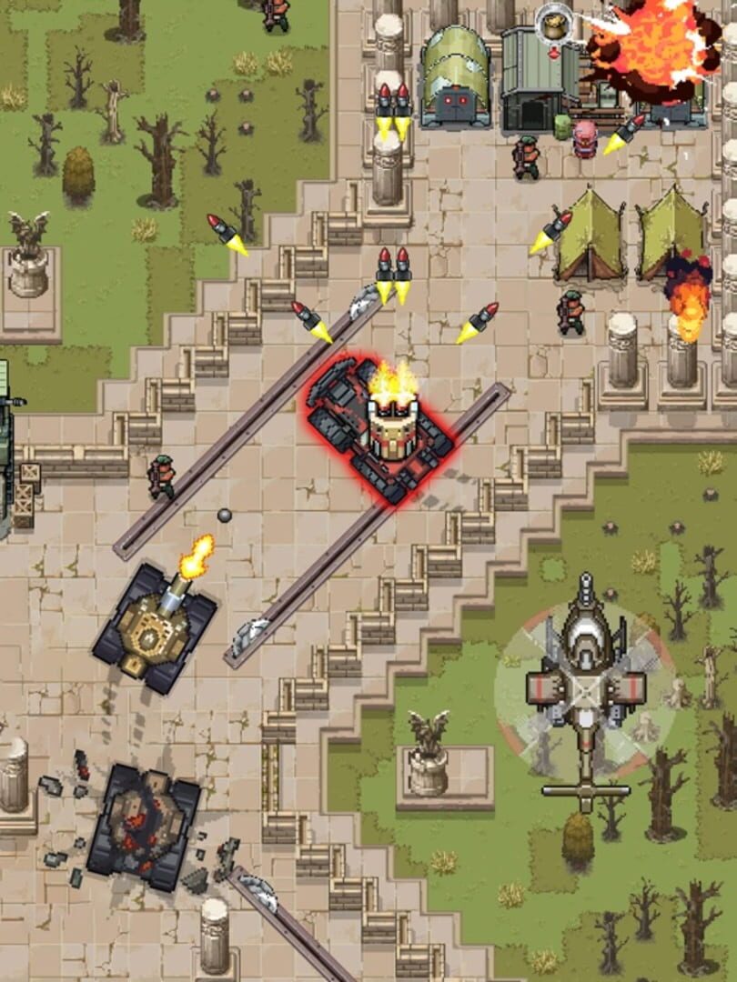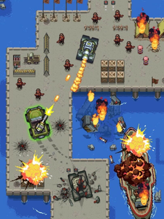 Playing is simple, swipe on the screen to move your pixel jeep around while attacking within the weapon's radius. Eliminate all foes to complete missions such as rescuing your brothers-in-arms and flying them to safety. Utilize various tactics such as burning the battlefield to gain additional skills, shooting down the electrical station to gain access to new areas, and become the ultimate Top Gunner. Upgrading weapons and jeeps to their maximum capabilities can also help you reach the top.