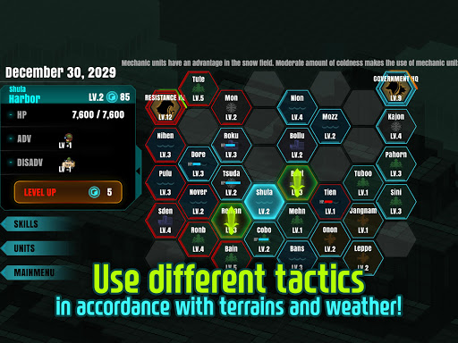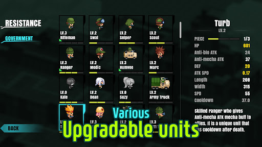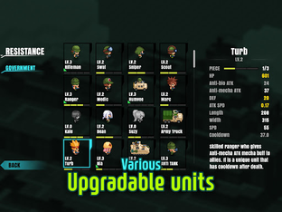 Units and skills are automatically upgraded through battle rewards. You can also repair or level up any desired zone with the supplied buck.