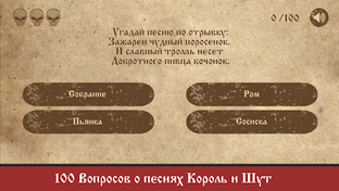 You need to give correct answers to the questions, choosing one of the four options. In the game you will find only questions on the theme of the songs of the group "Korol i Shut".