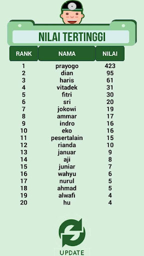 Will be accompanied by player statistics that include the percentage of true and false, the number of true and false, the average time answering one problem, so the user can know his abilities. With this statistic the user is expected to be able to know his own ability in solving problems.