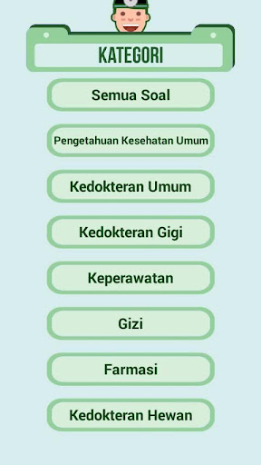 Includes: UKDI UKMPPD General Medicine UKDGI Dentistry Pharmacy UKOM Nutrition UKNI Nursing UKBI Midwifery Veterinary Medicine Indonesian Health Quiz is a learning application for health circles through Android.
