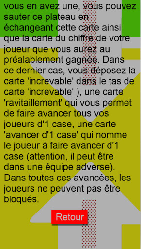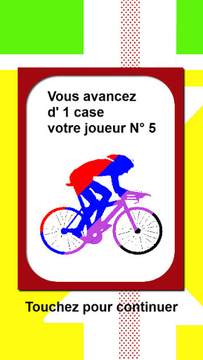You earn what is written as a result. This can be a 'puncture-proof' card which allows you to advance directly to the "puncture-proof" square all the players positioned 1 square before the "puncture-proof" boxes, a 'supply' card which allows you to advance all your players. '1 square, a card' move forward 1 square 'which names the player to move forward 1 square (be careful, he can be on an opposing team). In all these advances, players cannot be blocked. ",