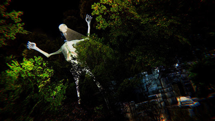 Rising out of the old cemetery, big as an old (macabre) telephone pole. Was this some kind of bizarre art piece the authorities hadn't gotten wise to yet? Even as she stepped out of the car, the megaphones on its "head" screeched to life. A buzzing, doubled voice screamed random words at her. At this point, it jerked into motion, striding down the hill towards her.
