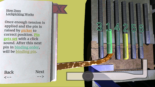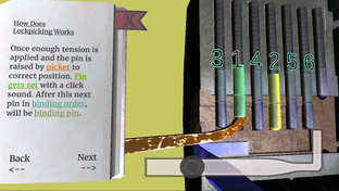 This game will walk you through how locks work and how to pick them using traditional tools (Which is adaptable to everyday tools like hairpin and paperclips). You will learn about a lot of different concepts like;