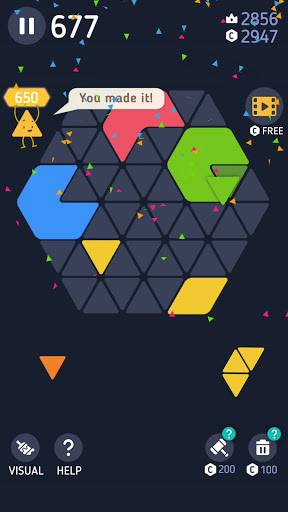 Simply drag the triangles onto the grid and combine them with the same color to form a hexagon! Create as many hexagons as you can to fill up the gauge and create the ultimate Rainbow Hexa!