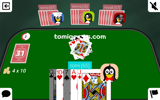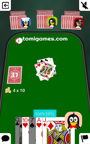 One can play a card if it corresponds to the suit or value of the open card. E.g. on a 10 of spades, only other spades can be played or other 10s. If a player is not able to, they draw one card from the stack. If he can play this card, he may do so, otherwise he keeps the drawn card and passes his turn. If the drawing stack is empty, the playing stack (except for the topmost card) is shuffled and turned over to serve as new drawing stack.