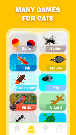 14 games for cats: balls, spider, fish for cat, mouse, cockroach, flying fly, birds, crawling lizard, ants, turtles, snake, laser for cat, balls, food for cat.
