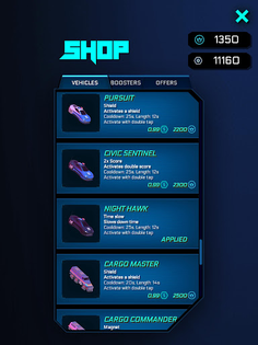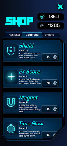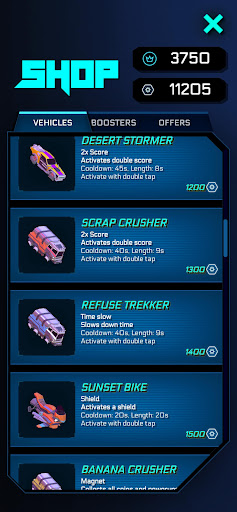 Start with the Sunray GT, then upgrade to more powerful cars such as the Midnight Rider, jet ski vehicles, flying vans, and flying police cars. There are also powerful vehicles like Cargo Master and the Dustbuster X. Try to unlock them all and feel new levels of adrenaline jet car driving. Each skin now comes with special abilities like 2x score, time slow, magnet, or shield, activated by double tapping during gameplay. Abilities have different lengths and cooldowns depending on the skin.