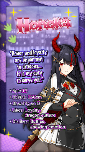 Meet Honoka, a shy but fiercely loyal dragon girl who will do anything to support and make your time at Deagon Academy more enjoyable. Her stoic demeanor hides a young woman who struggles to express herself, but with your help, she may discover her true potential.