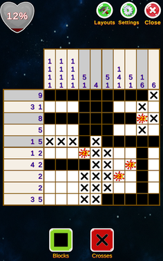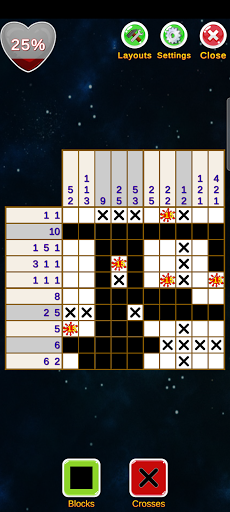 Solve the number cross puzzles using logical deduction technique and have a lot of fun with this Nonogram Picture Cross Sudoku game! Fill the square with color or cross (x) according to the requirement of the row or column and keep solving the brain training logic puzzle for fun and brain exercise!