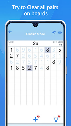 You can play a number-matching puzzle to calm down and relax your mind after a busy day. Find matching number pairs on the board, think about the best way to match, then clear the board to refresh the highest score! Feel the magic of numbers and give yourself an uplifting power!