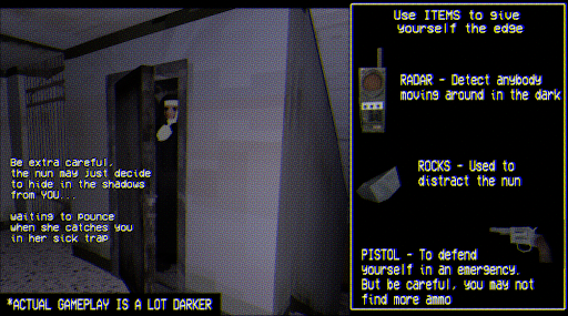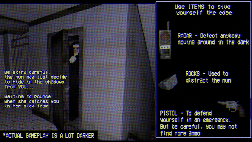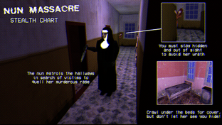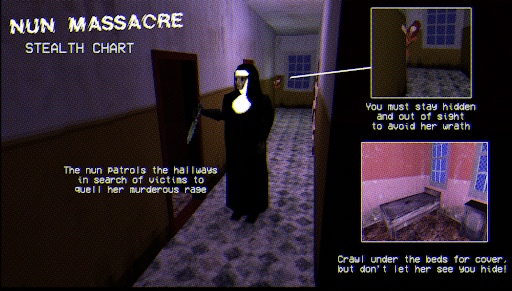 Do you have the courage to survive a terrifying night of hide and seek with a HOMICIDAL NUN? Discover the secrets of her nightmarish lair and escape with your life! NUN MASSACRE is a stealth horror game with 5th gen graphics, inspired by the classic Playstation 1 era. Pick your preferred image format - VHS, black & white or psx - and explore multiple endings and secrets while you try to survive the night!