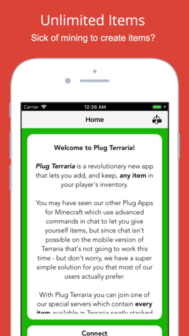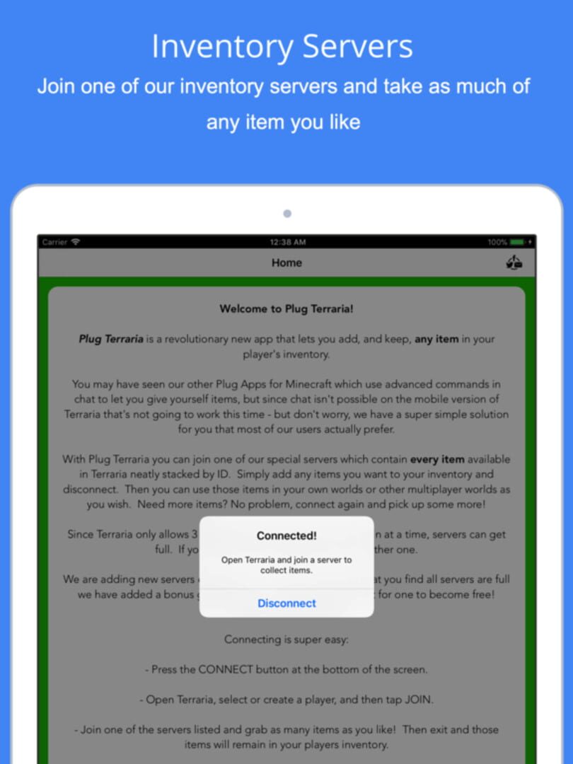 You won't find any additional fees or in-app purchases with Plug for Terraria. This app provides an endless supply of items for you to keep permanently.