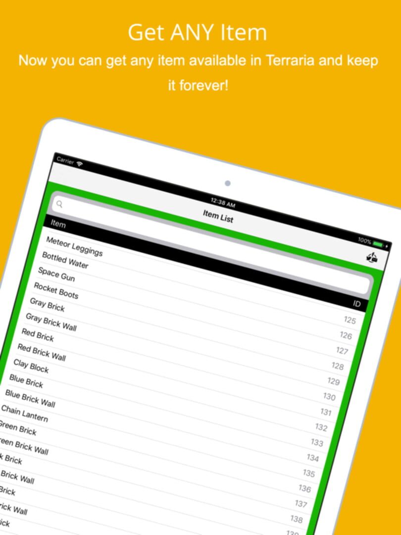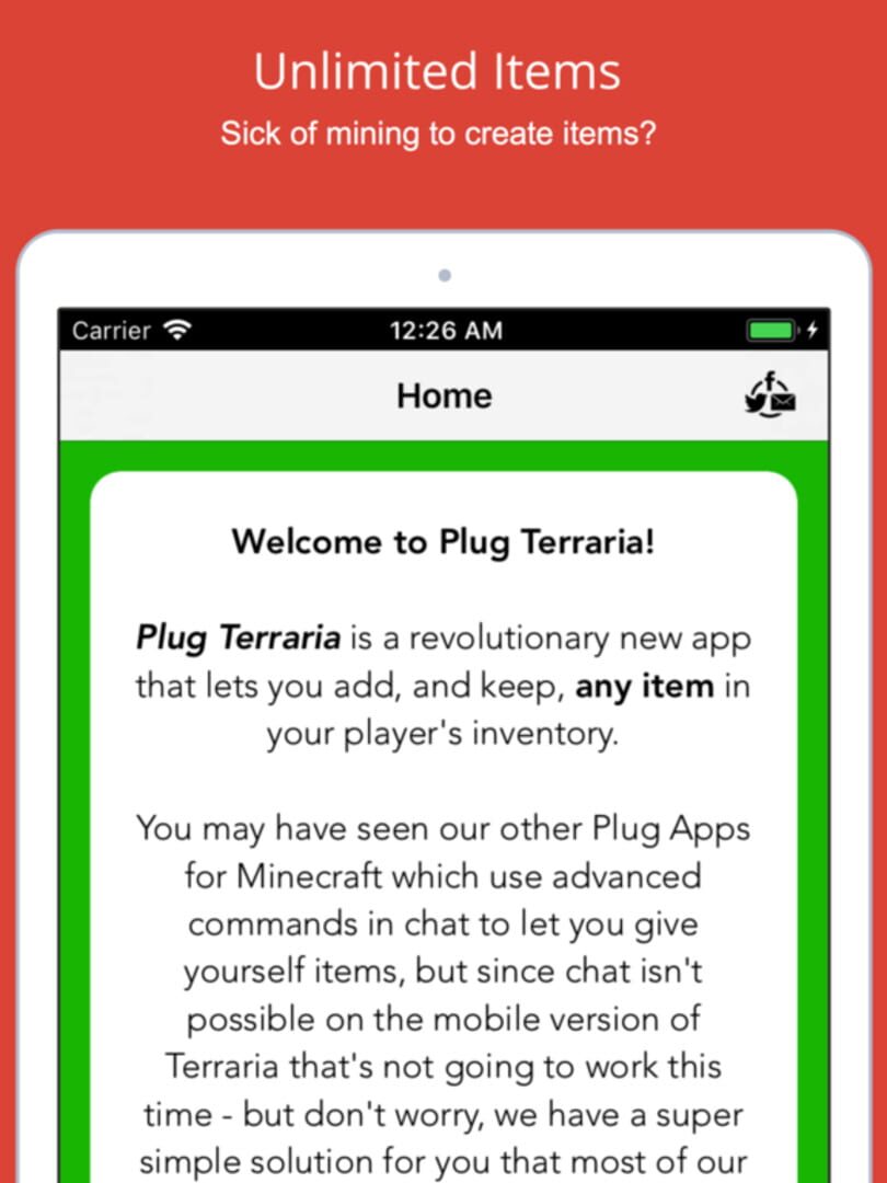 Add any item to your Terraria inventory with the revolutionary new app Plug for Terraria; no in-app purchases needed.