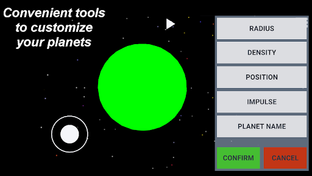 Build your own universe, and simulate all the planet orbits in infinite space with realistic physics. Сhoose from great variety of celestial bodies stars, planets and theirs moons from which you will build a unique universe. Save your universe and continue to extend it later.