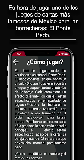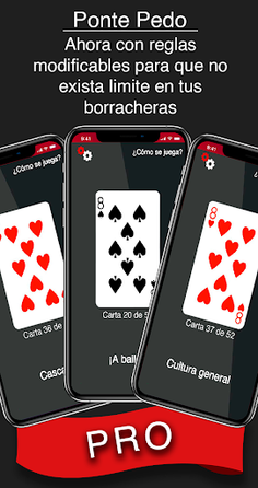 En esta versión de paga de "Ponte Pedo" podrás modificar las reglas a tu gusto para que no existan límites en tus borracheras. El Ponte Pedo es un juego muy famoso en las borracheras mexicanas. Diviértete jugando con las 52 cartas (Sin contar al joker) que una baraja tradicional tiene. No te preocupes más por perder o mojar tus cartas, adquiere esta App y que la borrachera comienze!
