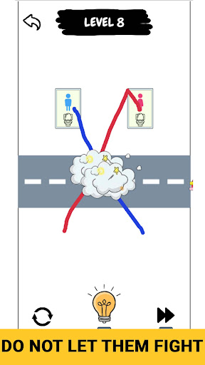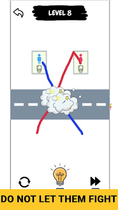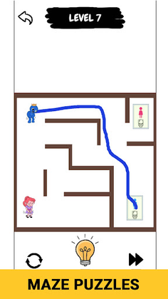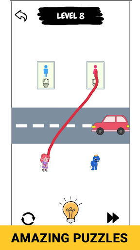 The game features a unique draw puzzle mechanic that requires you to draw lines in blue and red to help guide the boys and girls through each level.