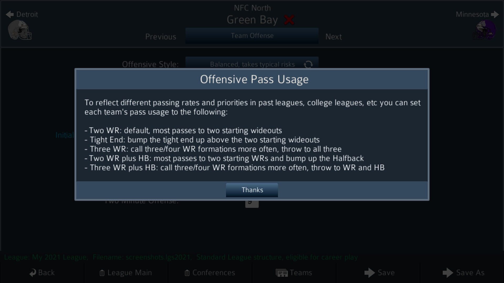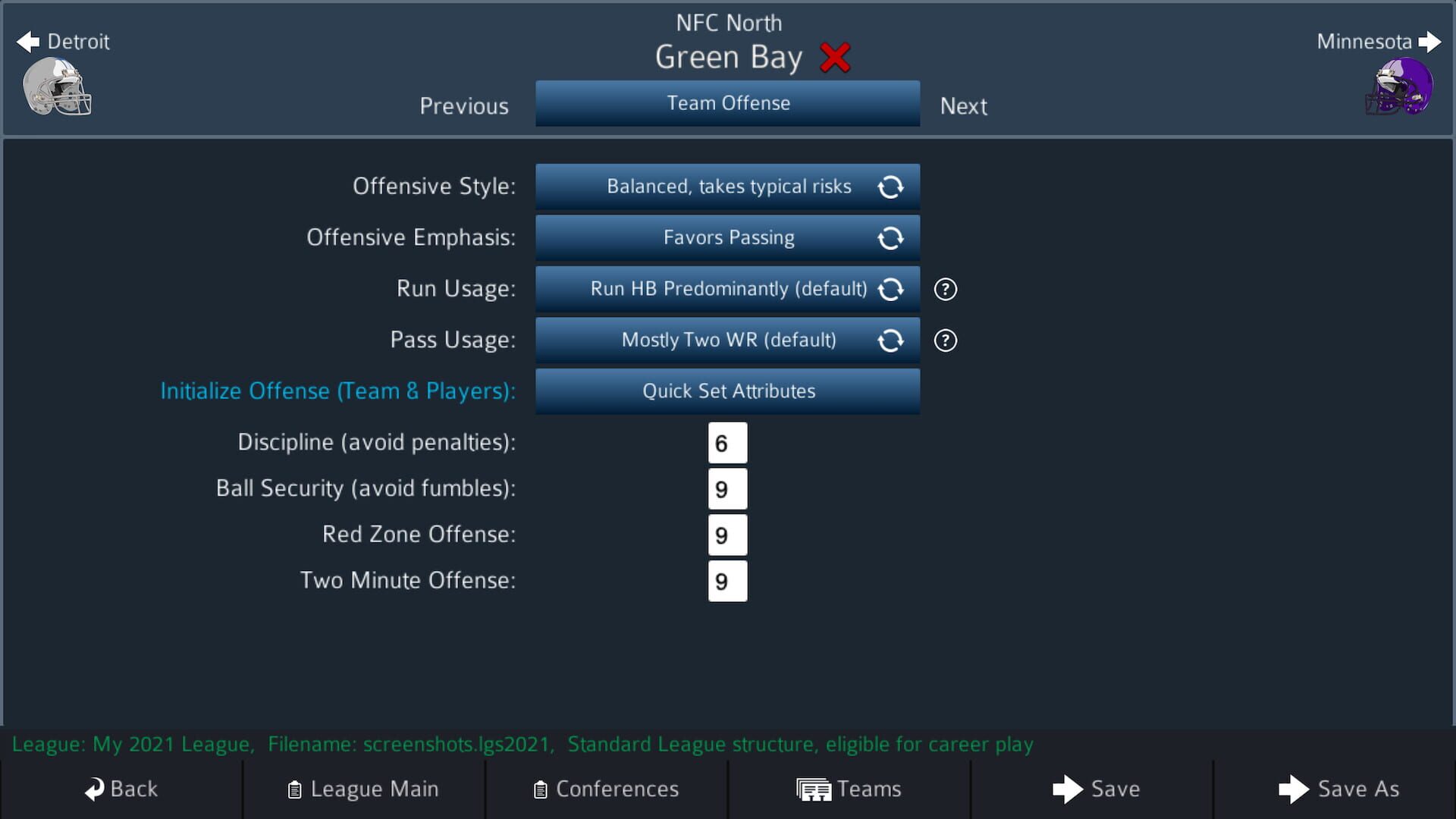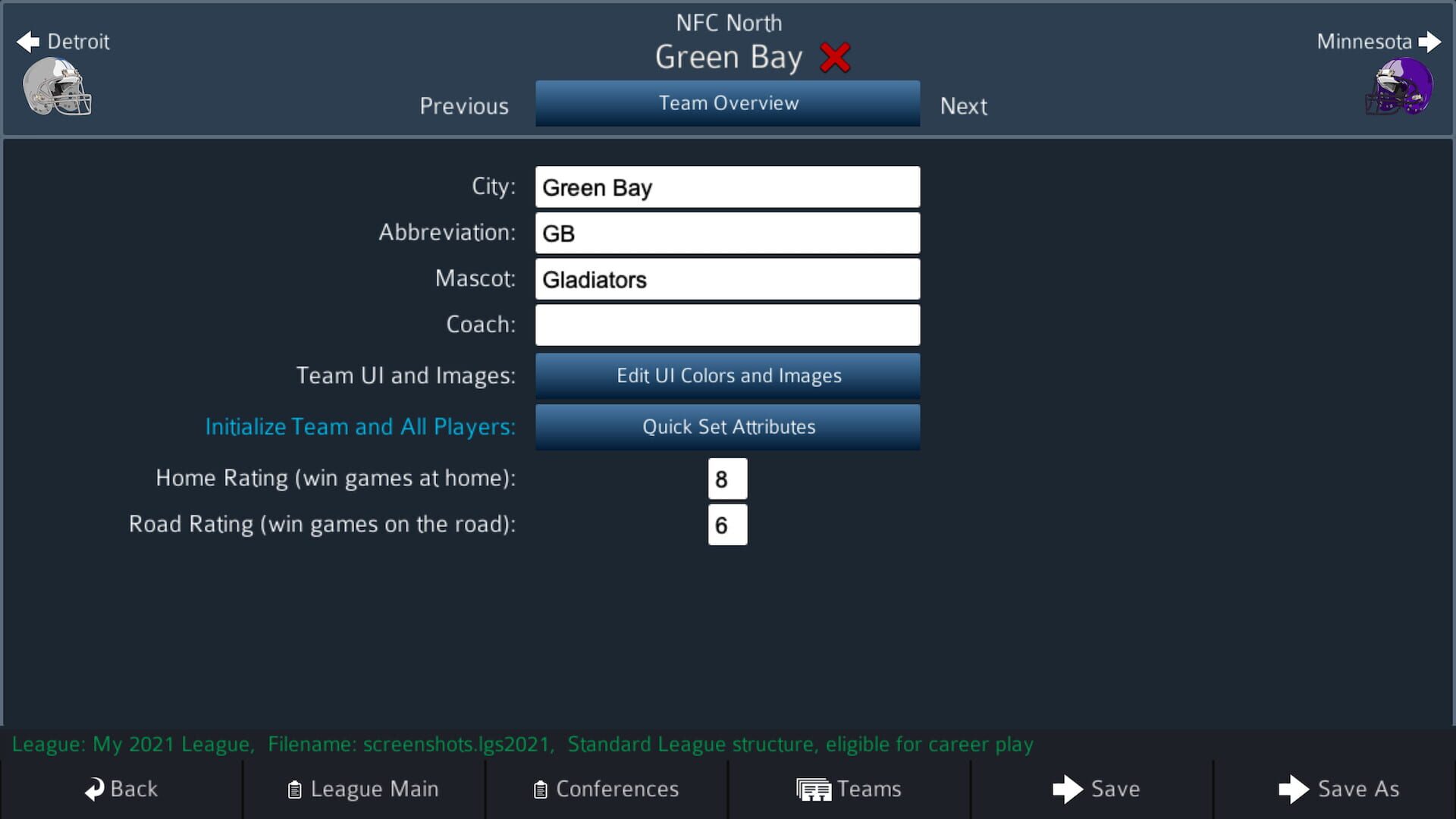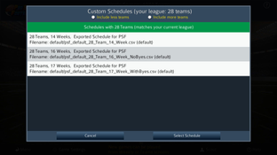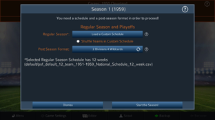 The game includes a Pro 2021 league and a starter college league with 130 teams, and over thirty schedules (as csv files) from which to choose. Modders are already creating more leagues, image sets, sounds, and schedules, so you can play any real season or create your own dream matchups.