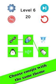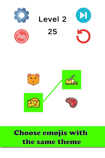 Connect pairs of emojis that share a common theme, unraveling intricate associations between vibrant symbols in this engaging gameplay experience.
