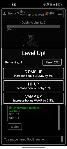 Players can upgrade their stats upon level up, choosing 3 possible upgrades and 2 reroll chances per level.
