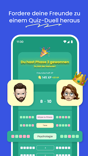 Am Anfang einer Runde wählst du eine Kategorie aus und beide Spieler beantworten fünf Fragen. Das passiert Runden-basiert, ihr müsst also nicht beide gleichzeitig online sein. Eine Phase geht dann über fünf Runden und am Ende wisst ihr, wer der bessere ist!