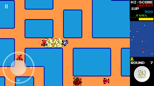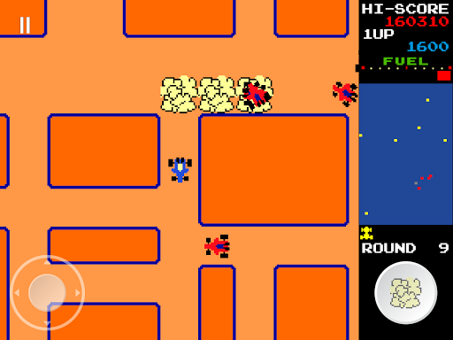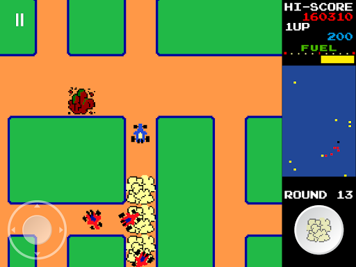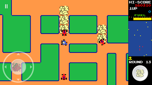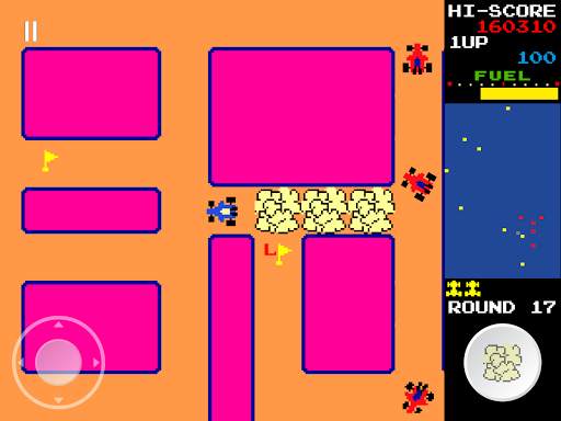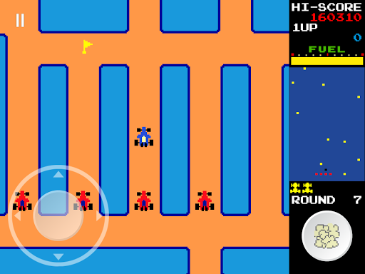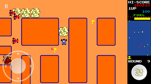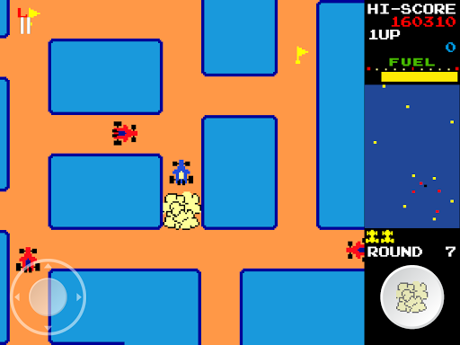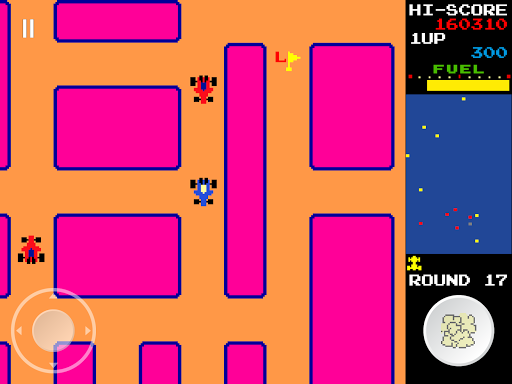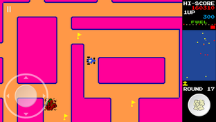 The car automatically moves in whichever direction the joystick/d-pad is pressed, but if it runs into a wall, it will turn and continue. The player must collect all of the flags to clear the round and move on to the next round. The flags increase in value as they are collected: the first is 100 points, the second is 200, the third is 300, and so on. There are also special flags (indicated by red S) — if the player collects it, the value earned from flags doubles for the rest of the round. If the player dies, however, the double bonus is lost. The player will also obtain a fuel bonus after get the lucky flag(indicated by red L) and after the round is complete, and it varies depending on how much fuel is remaining according to the fuel gauge.