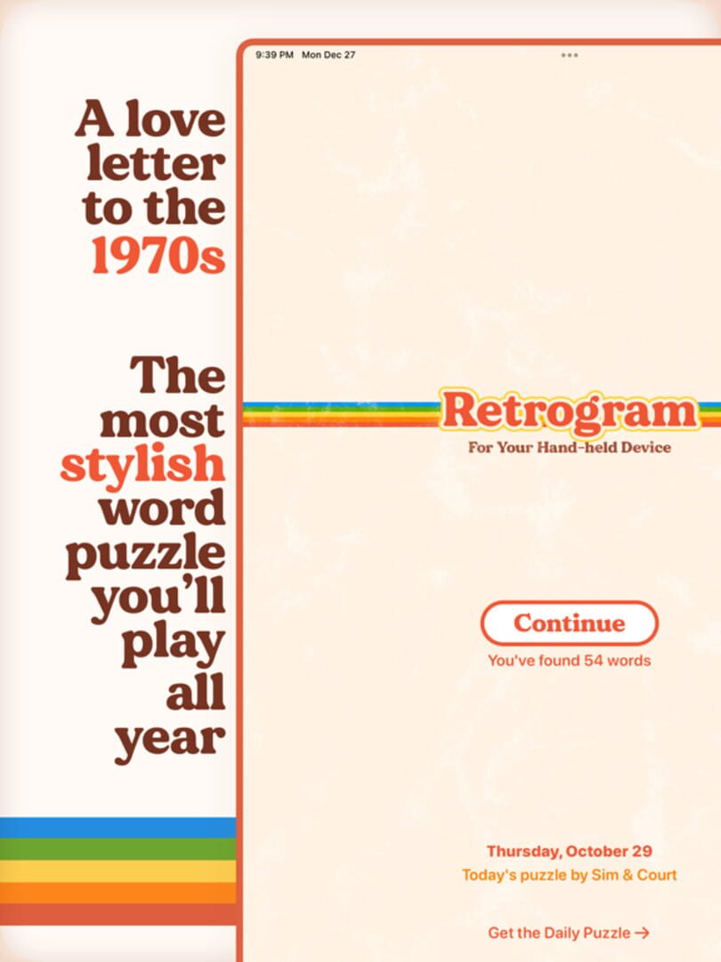 Retrogram: daily puzzles with seven letters to make words. Stylish and ad-free, with shareplay and Apple Watch support.