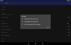 ♦ Select player mode: application AI as white/black player or human vs. human mode