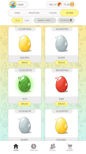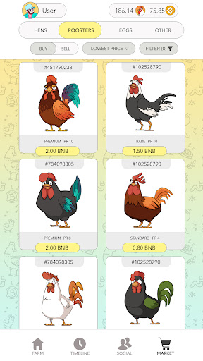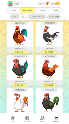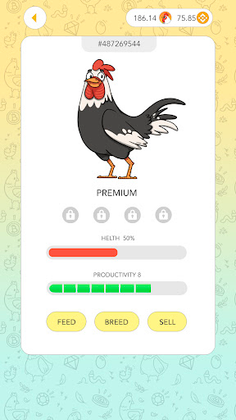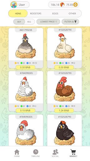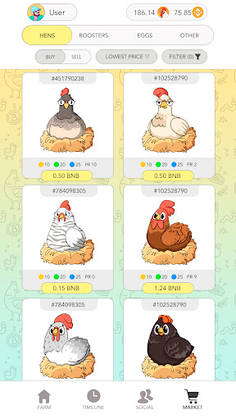 To get started to play Rich Hens, you have to own one or more NFT hens. Hens lay eggs that contain tokens. Player collects the eggs and receives tokens. You can also breed new NFT chickens, grow and sell them for tokens or keep for your self to get more eggs.