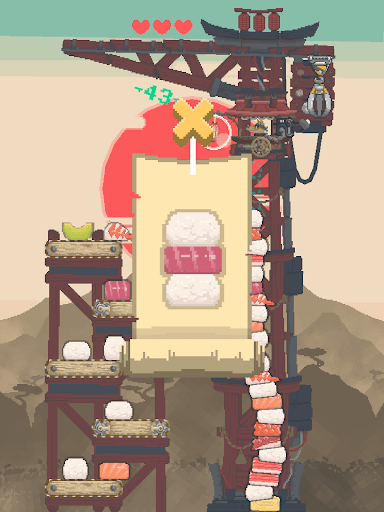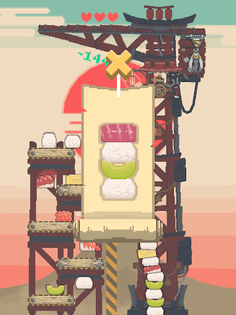 Stack sushi perfectly, don’t miss any placement and when you get a streak of three perfect pieces, you'll activate the fever mode, changing the claw for a sushi cannon with which pieces fall non-stop at a frantic rate in a shooter mini game.