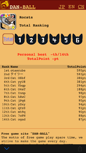 As the 4th mobile game from "DAN-BALL", this racing game promises a hilarious adventure with quirky felines on a space rocket, as they crash into walls and soar towards the finish line. Utilizing your device's tilt function, take control of the rocket and navigate the whimsical cats through the winding course in record time.