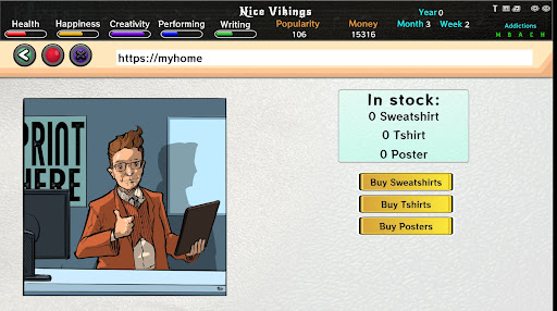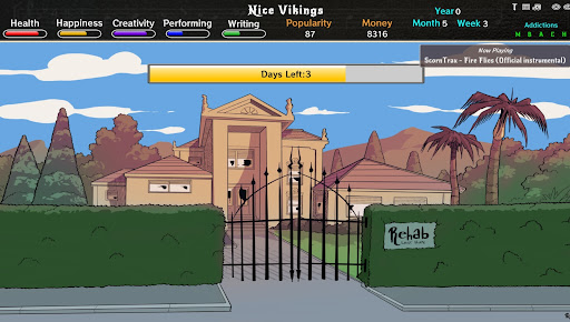 Manage your health and other skills to get the best out of every action you are taking. Practice, check yourself into rehab or go on vacation. After several play throughs you will master the choices presented to you and start writing better songs, have better gigs and maybe reach the peak of your career.