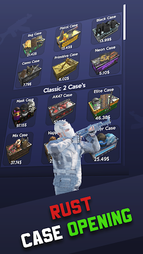 Build up your inventory, play a simple case clicker and earn rust skins. Level up your clicker and collect all achievements. Open unique rust cases in our case simulator. Join to the jackpot to have a chance win a lot of new items and more!