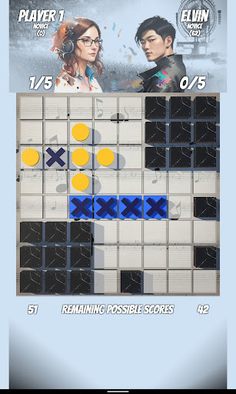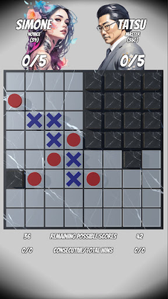 With an 8x8 game board, Savvy Four features random blocked tiles, ensuring that no two games are identical. Also, the game supports five ranks: Novice, Apprentice, Journeyman, Master, and Grand Master. AI opponents with senior ranks choose smarter moves to win.