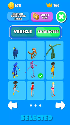 ✔ Break and destroy more transport & body of characters to win! Once you skip a beat, you lose the game! Stickman, Rainbow friends, The girls, ... can ride a bicycle or a bus; drive a sports car, scooter, taxi, Icecream car,... and even a rocket!