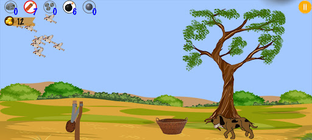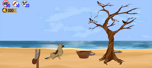 Sling bird hunter consist of several levels, Level one of Sling bird hunter is a place with a tree and a dog, pigeons sit on tree, when you hunt bird dog collects hunted bird in a basket.