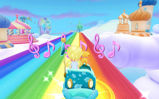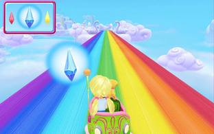 Missing Color Challenge – the Notto Prince has stolen a color stripe from the Rainbow Cove track. Pedal to select the missing color from the carousel of color choices or mix two colors to make the missing color. Press the handlebar button to select and then pedal to fill in the color to continue your journey.