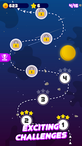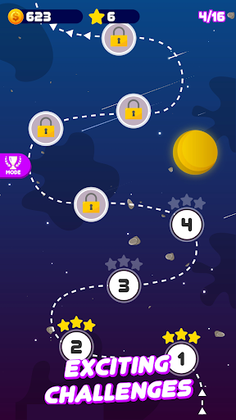 ✓ When the spaceship is flying through the roads, predict the dart's movement to hop and collect bonus rewards!