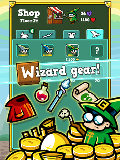 As you journey through the tower, you will collect gold that has been dropped by the monsters you've vanquished. This gold can be used to purchase items including wands, hats, and robes, each with their own magical abilities and special effects, making you even more of a fearsome opponent.