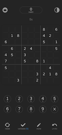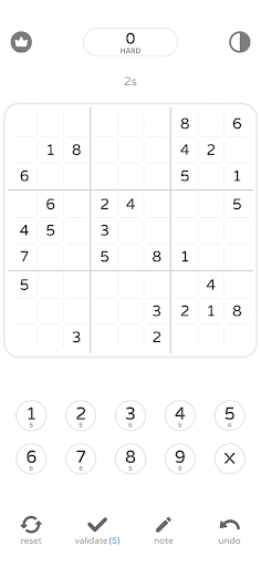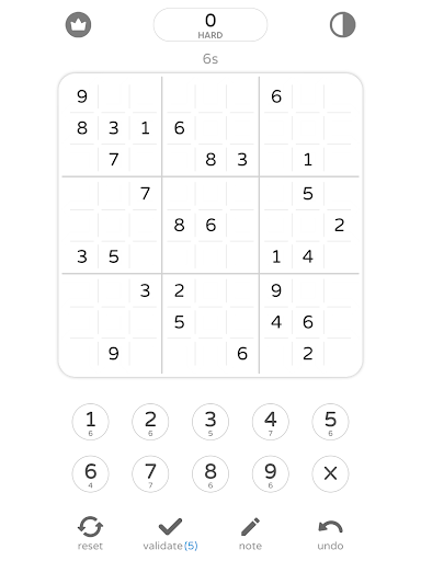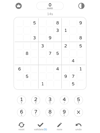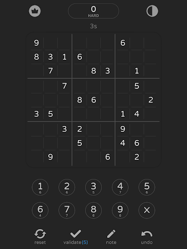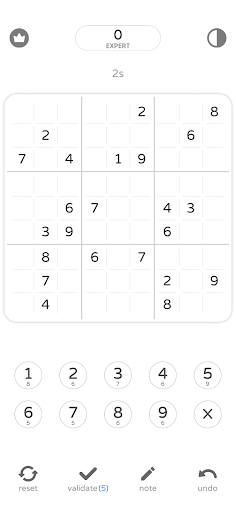 The user interface is minimal and fast - starting a new Sudoku or continuing right where you left off is just one click away. There are no loading screens. What is more, you do not have to worry about not finishing a Sudoku. If you are in a hurry, just hit back or leave the app in any other way and the app takes care of saving your progress seamlessly. This for all difficulty levels separately.
