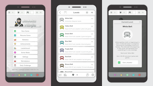 Sudoku Ninja is based on a martial arts theme with difficulty stages assigned to belts ranging from white belt to black belt. For the Sudoku grandmasters, there is also a Ninja level which features some of the most difficult Sudoku puzzles in the world.