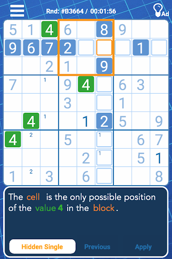 In Sudoku S. , there is an advanced hint system. It teaches you solve sudoku step by step using popular sudoku techniques: Hidden Single, Naked Single, Hidden Pair, Naked Pair, Pointing, Claiming, X wing, Swordfish, etc.