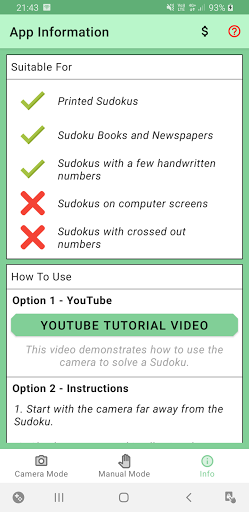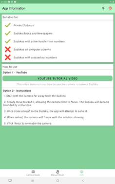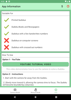 The app can currently solve an empty Sudoku (no handwritten numbers) or one with a few handwritten numbers, so long as they are written clearly. If the handwritten numbers are not written clearly, or scribbled out, the app may have difficulties. But don't worry, 'Manual Mode' can always be used instead, should you have any issues.