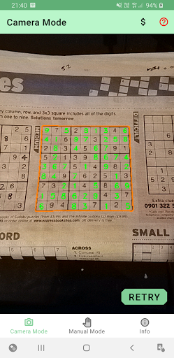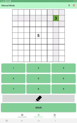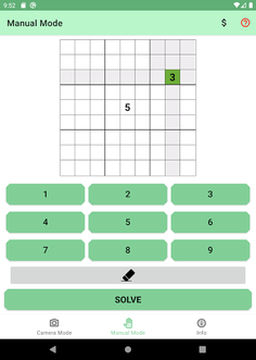 Manual Mode - Here, numbers can be placed into the grid manually and solved using a 'Solve' button. This is a backup in case the automatic mode is unable to solve your Sudoku.